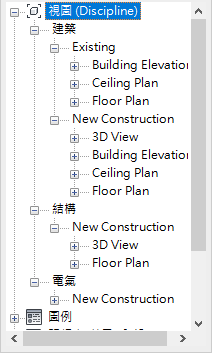 依預設,專案瀏覽器將顯示所有視圖 (依視圖類型)、所有圖紙 (依圖紙號碼及圖紙名稱) 和所有明細表和數量 (依名稱)。