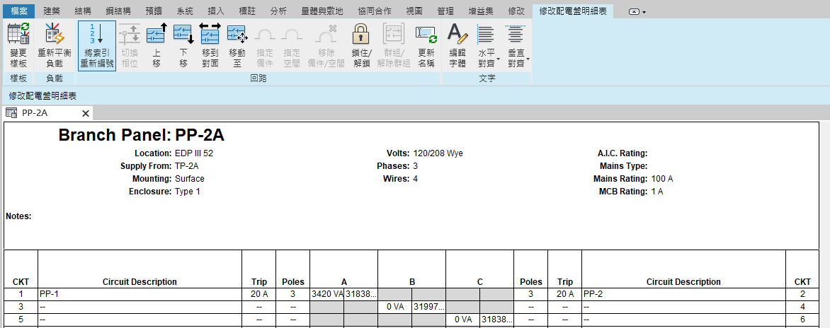 當顯示配電盤負載表時,您可以重新排列配電盤上的回路,方法為上下左右移動它們,以及將它們分組並鎖住它們。您也可以平衡相位之間的負載、指定備件和空間,並更新回路名稱。