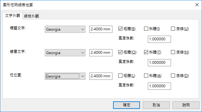 變更明細表中三種文字型式的格式:「標題」、「樓層」和「柱位置」,然後按一下「確定」。