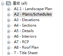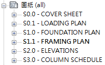 將圖紙加入專案時,圖紙會列示於專案瀏覽器中「圖紙 (全部)」之下。