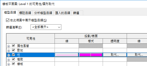 可見性與圖形顯示的大多數取代是在「可見性/圖形」對話方塊中進行的。但個別元素取代例外;此類元素的取代是在「視圖特有的元素圖形」對話方塊中進行的。