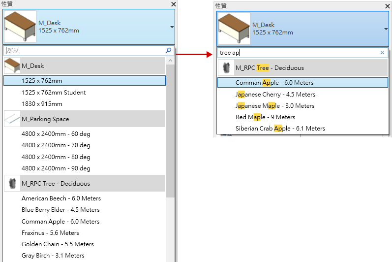 Revit 中提供搜尋功能,可讓您從較長的選項清單中更輕鬆地進行選取。您可以在以下功能領域進行搜尋: