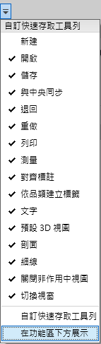 您可以將快速存取工具列顯示在功能區的上方或下方。若要變更設定,請在快速存取工具列上按一下「自訂快速存取工具列」下拉式清單