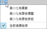 | 指定偏好的功能區最小化方法 | 按一下功能區頁籤右側的向右箭頭,然後選取所需的行為:「最小化為頁籤」、「最小化為面板標題」、「最小化為面板按鈕」或「全部循環檢視」。