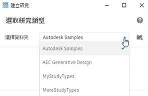 若要使用其中一個 Autodesk 範例建立研究,請在「建立研究」對話方塊中,對於「選擇資料夾」選取「Autodesk Samples」。