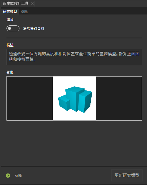 - 在範例研究類型的詳細說明主題中,請參閱「準備模型」一節,以取得有關如何使用範例 Revit 模型建立範例研究和試驗衍生式設計 的詳細資料。