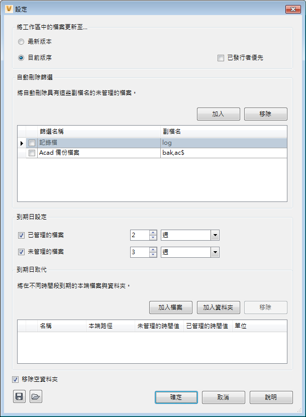 您可以指定將從工作區中自動刪除的不受 Vault 管理的檔案類型。同步期間,將刪除工作資料夾中與指定副檔名相符的所有檔案。系統提供了兩個篩選,二者依預設均為關閉:記錄檔 (.log) 和 ACAD 備份檔 (.bak、ac$)。