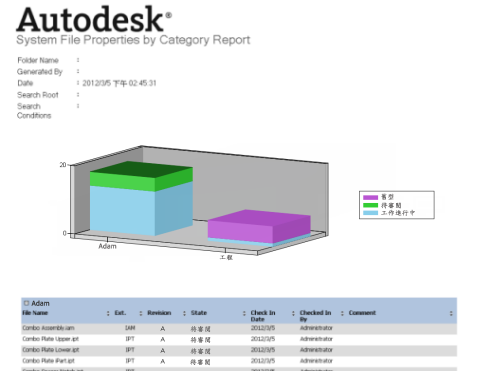 Autodesk Vault Client 提供了報告樣板。這些報告樣板包含圖表色盤,但這些樣板不具體指定為各個圖表元素指定何種顏色。當您使用資料對映功能時,可以指定如何對圖表元素進行顏色編碼。對圖表元素進行顏色編碼可讓您快速、可重複地檢視模型資料。
