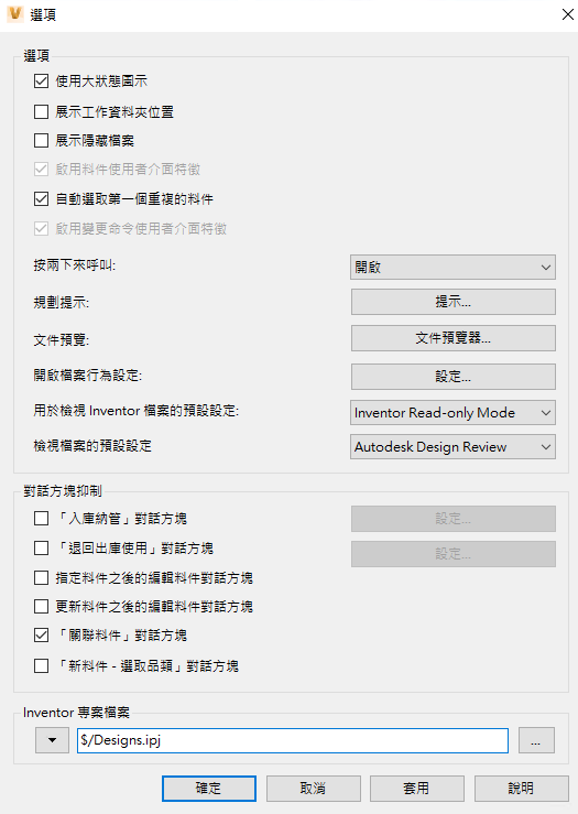 - 用於檢視 Inventor 檔案的預設設定