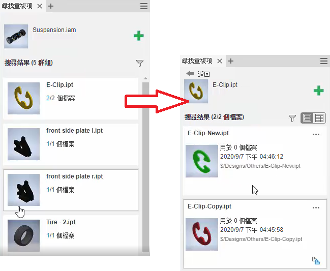 1. 按一下「搜尋」。零件搜尋結果會顯示在「尋找重複項」面板中。