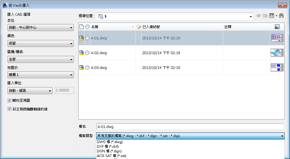 「從 Vault 匯入」可讓您將儲存在 Vault 中的 CAD 檔案或影像匯入至目前的 Revit 專案。