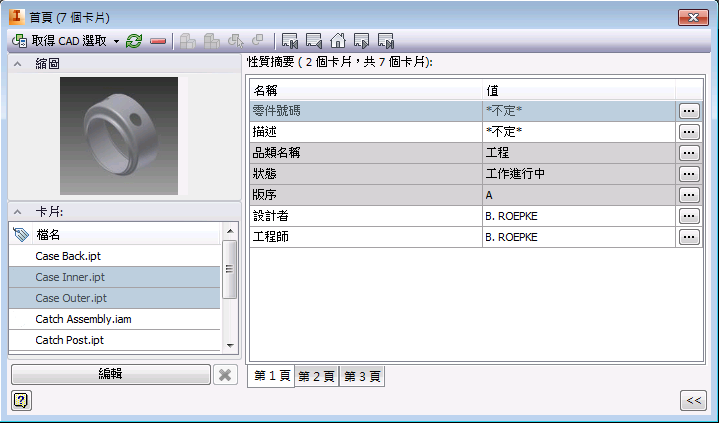 註: 如果在瀏覽器清單中選取多個零件,會在 CAD 圖元區上選取對應的零件,但資料卡不會更新。請參閱〈使用卡片組〉上的主題,以取得有關更新多個資料卡的更多資訊。