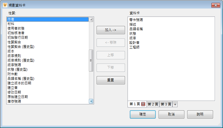 - 管理員可以透過確定資料卡使用的頁面數以及針對自訂管理體驗顯示的性質來規劃資料卡配置。可以透過 Autodesk Vault Client 中的「Vault 設定」對話方塊上的「行為」頁籤存取「規劃資料卡」對話方塊。