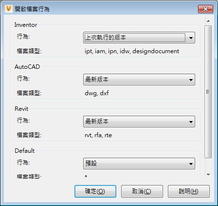 - 預設 - 使用 Vault 中的目前設定來開啟指定的 CAD 檔案。例如,如果您已安裝其他能夠開啟 Inventor 檔案的應用程式,並將 Windows 規劃為使用該應用程式,則依預設 Vault 也會使用該應用程式開啟 Inventor 檔案。