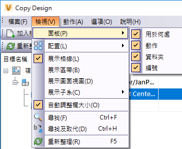 - 在「Copy Design」對話方塊中,按一下「檢視」>「面板」。