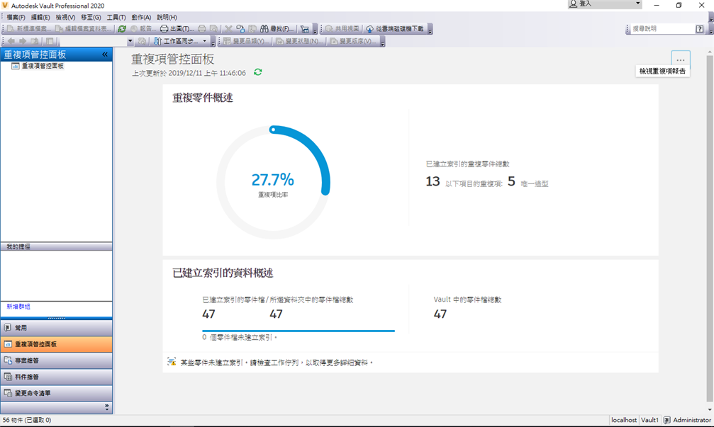 在對檔案建立索引後,您可以在「重複項管控面板」中檢視資料。在 Vault 用戶端中,按一下「重複項管控面板」。您可以檢視重複零件報告,也可以將該報告匯出為 Excel、PDF 或 Word 格式。