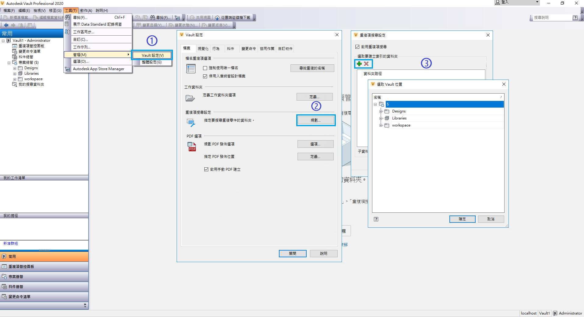 在「Vault 設定」對話方塊中,定義搜尋範圍。指定將為零件建立索引的資料夾。