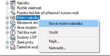 - Na kartě Vlastní v podokně Uživatelské úpravy: <název souboru> klikněte na znaménko plus (+) vedle uzlu Místní nabídky. Tento uzel se rozbalí.