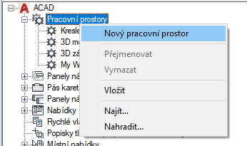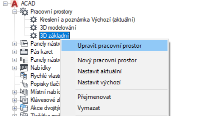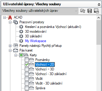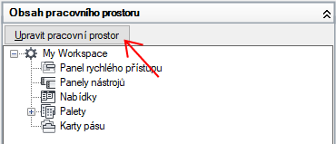 Nastavení aktuálního pracovního prostoru v editoru Upravit uživatelské rozhraní (CUI):