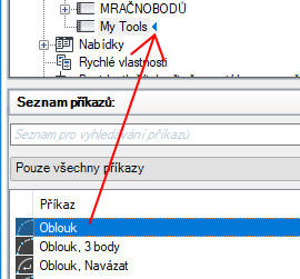 4. V podokně Seznam příkazů přetáhněte příkaz, který chcete přidat na panel nástrojů, do podokna Uživatelské úpravy: <název souboru>.