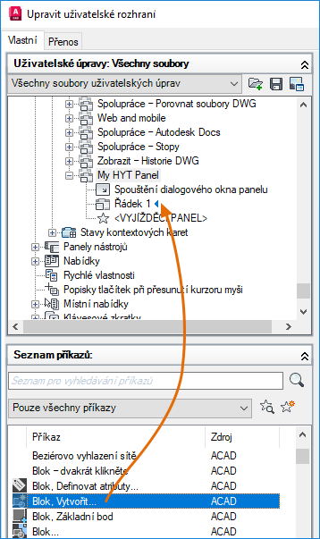 V podokně Seznam příkazů zadejte do textového pole Seznam příkazů výraz blok. Vyberte možnost Vytvořit blok (příkaz BLOK) a přetáhněte jej do pole Řádek 1 na panelu My HYT Panel.
