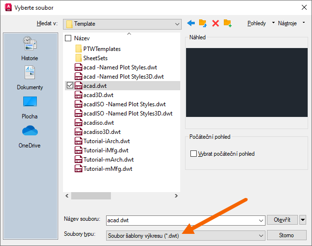 Když máte nyní vytvořenou a uloženou šablonu, začneme ji používat. Ve výchozím nastavení aplikace AutoCAD se při vytvoření nového výkresu vytvoří výkres ze šablony určené v poli Výchozí název souboru šablony pro RNOVÝ, v tomto případě acad.dwt. Změníme toto nastavení tak, aby se vytvořil nový výkres pomocí nové šablony.