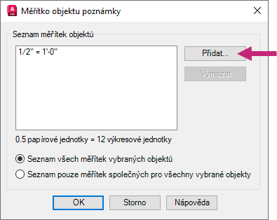 | OBJMĚŘÍTKO | Přidá nebo odstraní podporovaná měřítka pro objekty poznámek. |