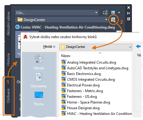 - Pokud chcete vybrat jiný výkres k nihovny ze složky DesignCenter, ujistěte se, že k arta Knihovna je aktuální (1) a klikněte na tlačítko pro navigaci mezi soubory (2).
