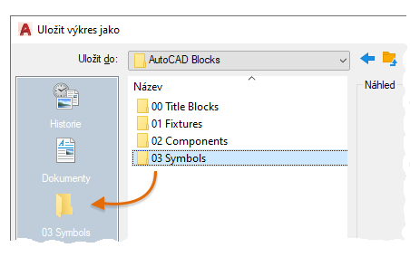 Tip: Když uložíte výkresy pro pozdější vložení, přejděte do složky, klikněte pravým tlačítkem a vytvořte několik dalších složek k uspořádání výkresů. Jeden nebo více bloků můžete přetáhnout na panel Místa, aby je bylo možné v budoucnosti snadno najít.