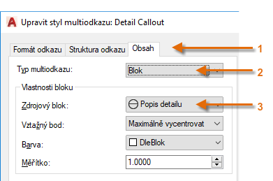 Chcete-li například vytvořit styl „odkaz na detail“, spusťte příkaz MODKAZSTYL. V dialogu Správce stylů multiodkazů klikněte na tlačítko Nový a zvolte popisný název nového stylu multiodkazu. Klikněte na kartu Obsah, vyberte položku Blok a potom položku Popis detailu, jak je znázorněno.