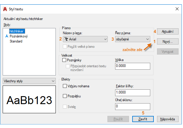 Při vytváření nového stylu textu zadejte jeho název a potom vyberte písmo a styl písma. Pořadí, v jakém klikáte na tlačítka, je uvedeno níže: