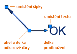 Nabídky uzlů se zobrazí, když přesunete kurzor nad šipku nebo uzly odkazové čáry. Prostřednictvím těchto nabídek lze přidat segmenty odkazové čáry nebo další odkazy.