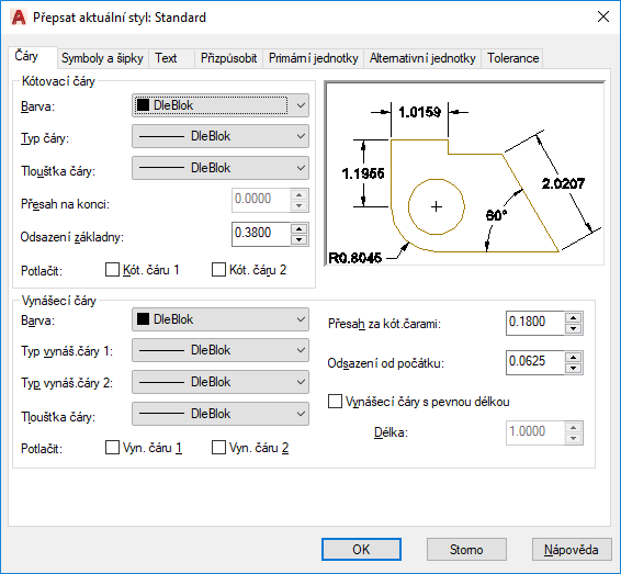 Výchozí styl kóty se nazývá Standardní (britské jednotky) nebo ISO-25 (metrické jednotky). Je přiřazen ke všem kótám, dokud jako aktuální styl kóty nenastavíte jiný styl.