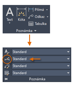 Název aktuálního stylu kóty, v tomto případě Stopař, se zobrazí v rozevíracím seznamu panelu Poznámka.