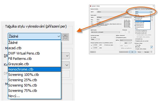 Tabulka stylu vykreslování poskytuje informace o zpracování barev. Barvy, které na monitoru vypadají dobře, nemusejí být vhodné pro soubor PDF nebo pro tisk. Můžete například vytvořit barevný výkres, ale černobílý výstup. Následující postup slouží k určení černobílého výstupu: