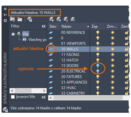 Jak je vidět na obrázku, hladina 10 STĚNY je aktuální hladina. Všechny nové objekty budou automaticky umístěny do této hladiny. V seznamu hladin zelené zaškrtnutí vedle hladiny 10 STĚNY potvrzuje, že se jedná o aktuální hladinu.