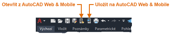Pokud si myslíte, že potřebujete přístup k výkresu ze vzdáleného umístění, zkuste použít příkazy Uložit do služby Web and Mobile a Otevřít ze služby Web and Mobile.