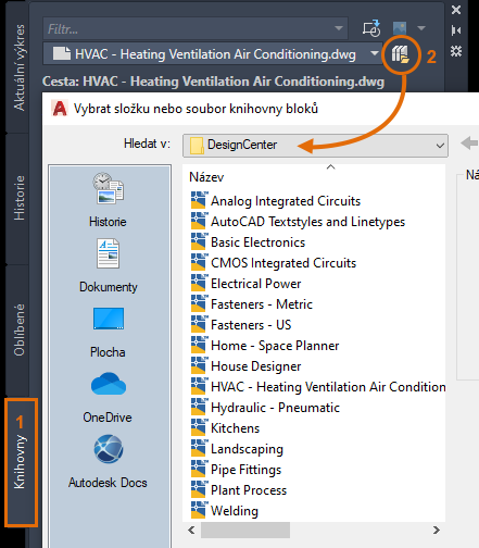 - Pokud chcete vybrat jiný výkres knihovny ze složky DesignCenter, ujistěte se, že karta Knihovny je aktuální (1) a klikněte na tlačítko pro navigaci mezi soubory (2).