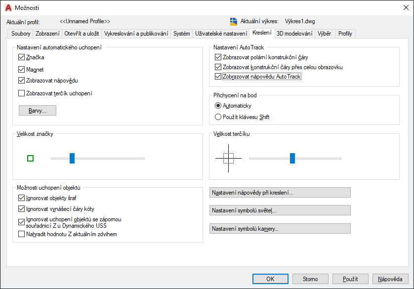 Určuje zobrazení značky, nápovědy a magnetu AutoSnap.
