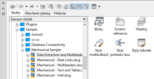 DesignCenter umožňuje rychlé vyhledání obsahu, například výkresových souborů, definic bloku a šraf.