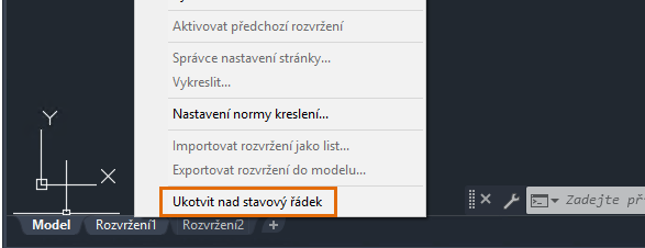 Klikněte pravým tlačítkem na kartu Model nebo Rozvržení a vyberte možnost Ukotvit nad stavový řádek nebo Ukotvit na úrovni stavového řádku.