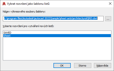 Určuje cestu ke složce, soubor šablony výkresu (DWT) a název rozvržení, jehož pomocí jsou vytvořeny nové listy.