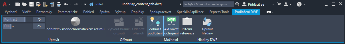 Vyberete-li ve výkresu podložení DWF, zobrazí se na pásu karet kontextová karta Podložení DWF.