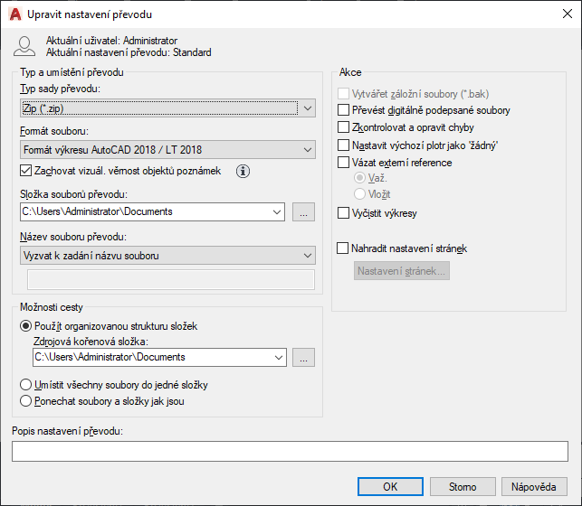 Pokud je tato volba aktivní, kontroluje výkresy na přítomnost chyby. Pokud jsou zjištěny chyby, budou výkresy automaticky obnoveny. Možnost Nastavit výchozí plotr jako „žádný“ změní nastavení tiskárny nebo plotru v sadě převodu na hodnotu Žádný. Nastavení lokální tiskárny/plotru není obvykle pro příjemce důležité.