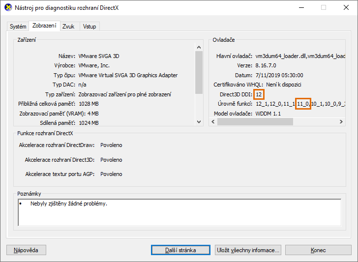 Moderní grafický systém vyžaduje hardware a software podporující rozhraní DirectX 12. Minimální úroveň prvku DirectX 12 je 11_0. Tyto požadavky můžete ověřit spuštěním příkazu DXDIAG v nabídce Start systému Windows. Toto je příklad systému, který splňuje požadavky: