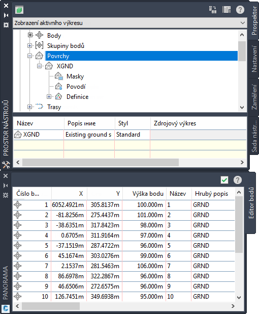 Okna Prostor nástrojů a Panorama sdílejí několik funkcí.
