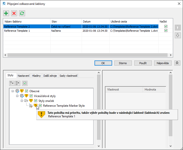 - Můžete kliknout na tlačítko Použít. Použijí se všechny duplicitní komponenty ze šablony s vyšší prioritou. Výběr duplicitních komponent ze šablony s nižší prioritou se zruší a tyto komponenty nebudou použity.