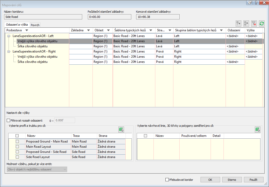 Můžete vybrat, který koridor v šabloně se má použít, a také můžete vybrat, jaké chcete použít povrchy koridoru, hranice a šrafování svahů.