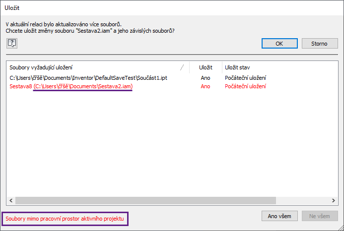 Dialog Uložit byl vylepšen a umožňuje nyní rychle identifikovat soubory, které se chystáte uložit a které nejsou ve vašem aktivním projektu. Soubory, které nejsou v aktivním projektu, se zobrazují červeně.