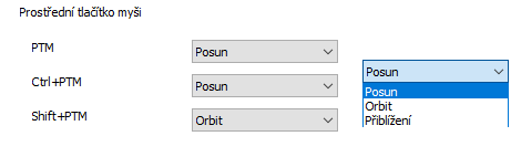 Karta Zobrazení v dialogu Možnosti aplikace nyní poskytuje nastavení, pomocí kterých můžete namapovat prostřední tlačítko myši na přiblížení/oddálení (zoom), posunutí pohledu nebo otočení (orbit).
